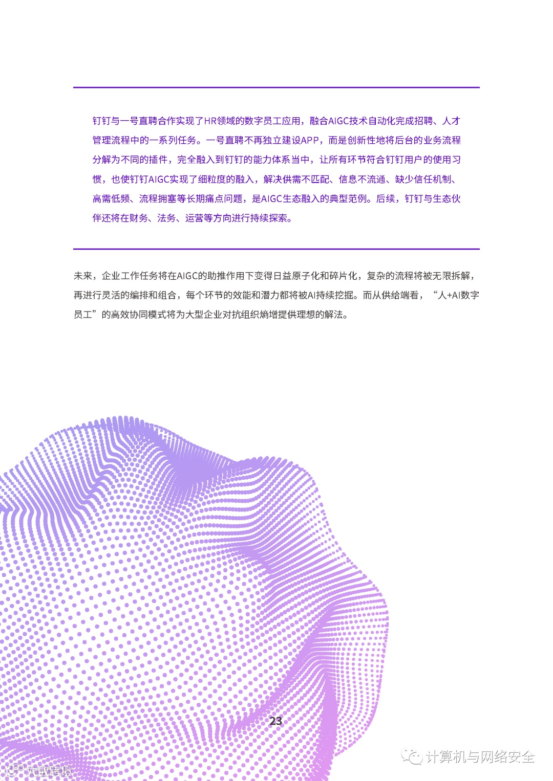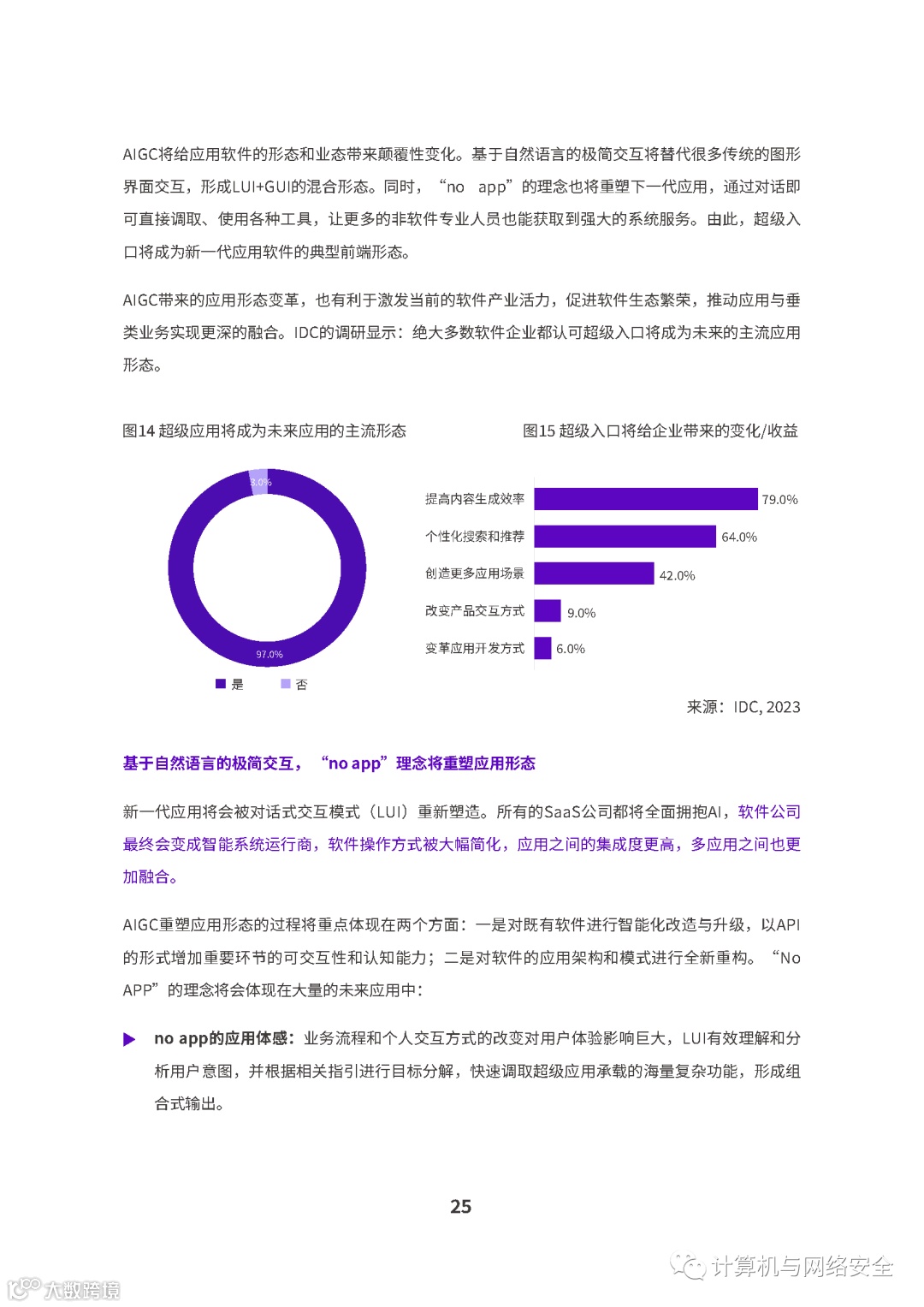 2023年,AIGC所代表的通用人工智能(AGI)技术引发全球范围内的持续激荡。AIGC在短时间里经历了三波进步浪潮:第一波是以GPT为代表的大模型涌现,形成了生成式人工智能(GenAl)发展的重要基础。第二波是应用层的快速创新,以生产力场景为最佳承载,使智能化从Chat向Work转化。第三波则是深度业务场景的应用,打通业务数字化全流程,服务实体经济。