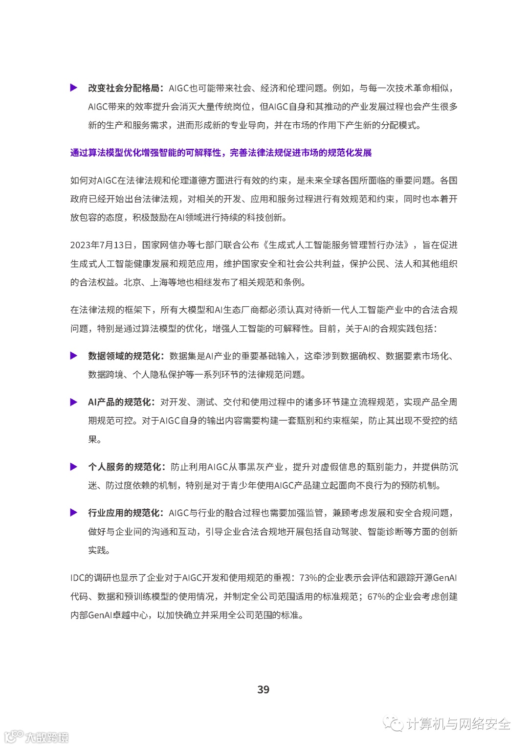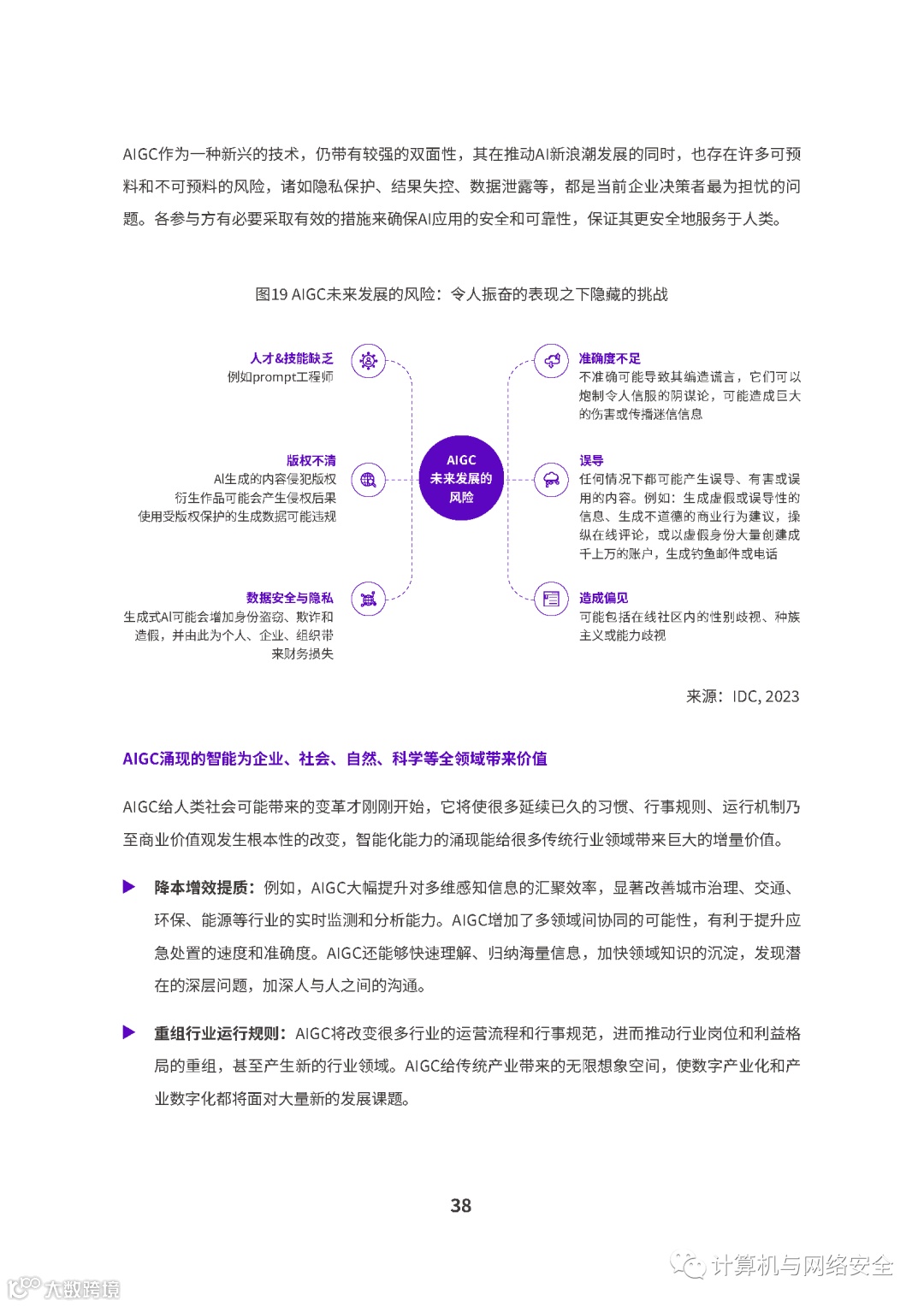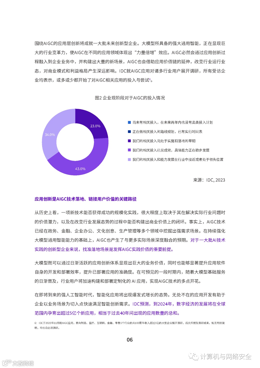 2024年将是Al的产业年,我们将看到越来越多的创新应用场景和产品形态不断涌现。中国是网络大国,也将是AI应用大国。然而,我们也应清醒地认识到AIGC的发展并非一帆风顺。数据隐私、安全问题、伦理挑战以及法规适应性等问题都需要被予以充分的关注和妥善的解决。这需要政府部门、科研机构、产业界以及各行各业的用户共同参与到AIGC的健康发展进程中来。我们要秉持开放创新的精神,加强跨领域、跨行业的合作,共同构建一个包容、公平、可持续的生态环境。