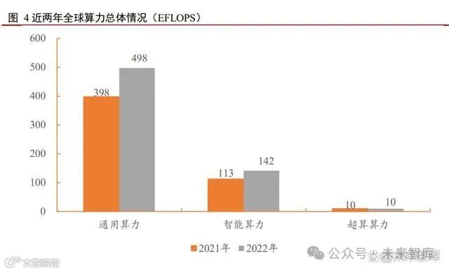 作为数字经济时代的重要生产力,2022 年我国算力核心产业规模已达 到 1.8 万亿元。算力规模方面,截至 2022 年底,中国算力总规模为 180EFLOPS, 排名位居全球第二。其中,通用算力规模为 137EFLOPS,智能算力规模为 41EFLOPS,超算算力规模为 2EFLOPS。中国智能算力正处于高速增长阶段,智 能算力规模同比增加了 41.4%,占比达 22.8%,超过全球整体智能算力 25.7% 的增速。
