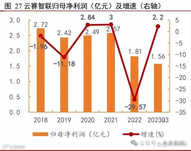 云赛智联是一家以云计算和大数据、行业解决方案及智能化产品为核心 业务的专业化信息技术服务企业。在推展数字经济、布局数字产业的大背景 下,公司以数字化转型为契机,加快数据中台和算力基础设施底座打造,提 升数字化转型全链服务能力。2022 年 11 月,公司成功中标上海超级计算中 心市公共算力服务平台建设项目,着手布局算力网络,打造上海市超大规模 人工智能计算和赋能平台,于 2023 年上半年顺利实现上电开机并完成项目初 验。为抓住算力中心发展战略机遇,并推动建设面向全国及长三角区域服务、 支持跨域资源调度的算力中心的需求,2023 年上半年云赛智联与仪电集团等 其他股东共同出资建立上海智能算力科技有限公司,进一步推进“做优 IDC” 战略的实施。2023 年前三季度公司业绩稳健增长,实现主营业务收入 37.06 亿元, 同比增长 19.67%;归母净利润 1.56 亿元,同比增长 2.20%;扣非净利润 0.99 亿元,同比增长 284.19%。单三季度,公司实现营收 12.08 亿元,同比下降 0.23%;归母净利润 0.63 亿元,同比增长 2.43%。公司前三季度扣非净利润 同比大幅增长,主要系 2022 年同期公司转让子公司仪电工程股权获益占比较 高所致。