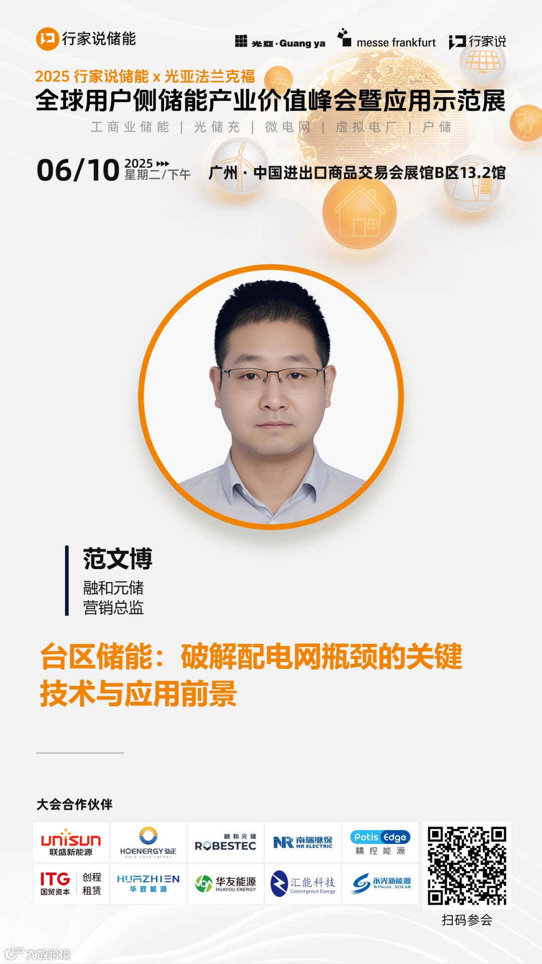 融和元储营销总监范文博将聚焦台区储能技术,深入剖析技术内核与落地价值,以《台区储能:破解配电网瓶颈的关键技术与应用前景》,通过结合多个真实案例,展示台区储能在电网治理中的成效,并探讨技术瓶颈与成本优化路径,展望台区储能与数字化、智能化技术融合的发展趋势,为行业探索提供新思路。