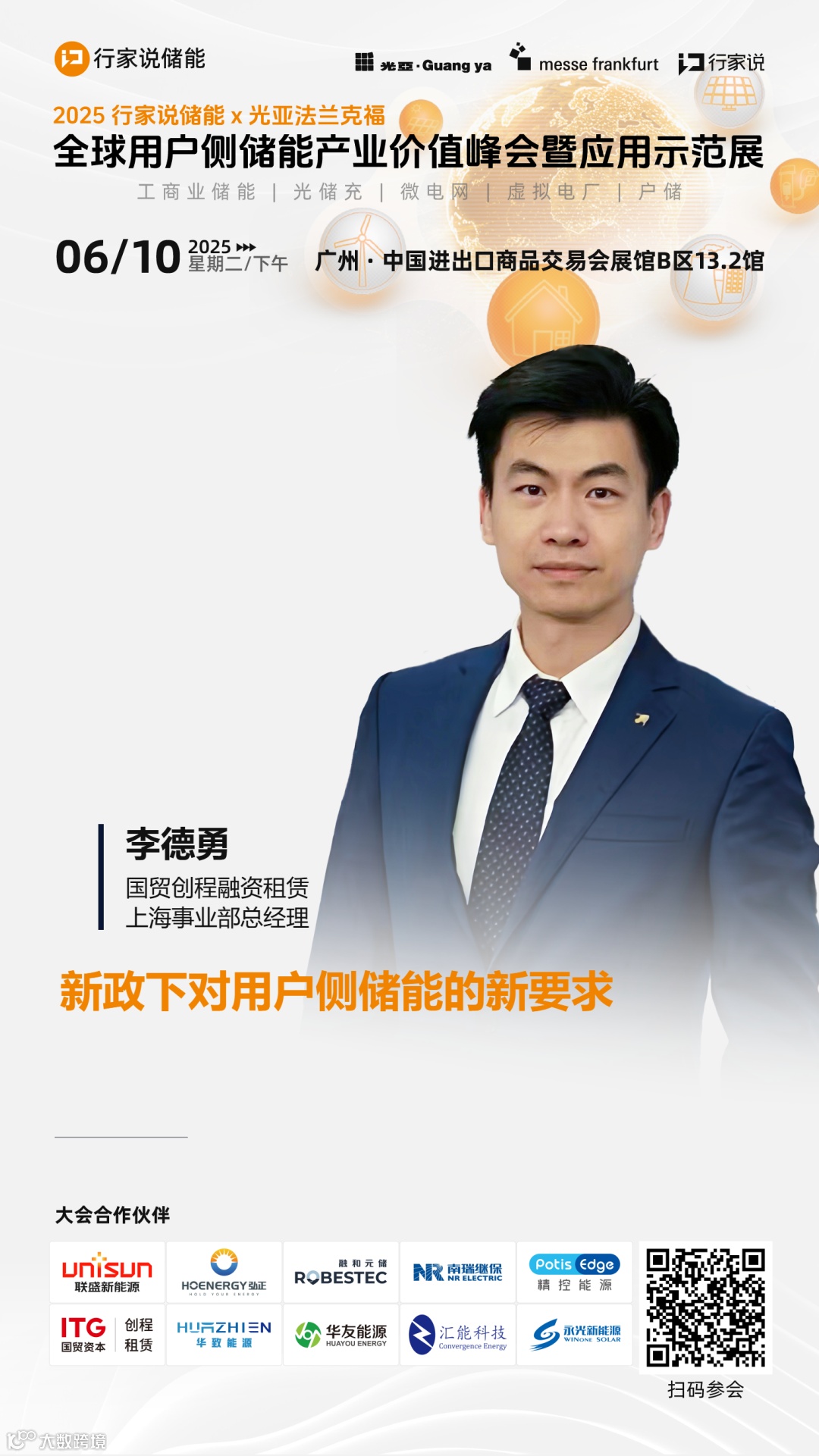 本次峰会上,作为资方代表的国贸创程融资租赁上海事业部总经理李德勇将以《新政下对用户侧储能的新要求》为题,为与会者进行解答。