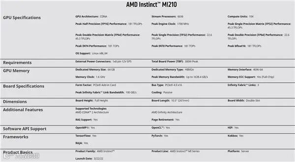 从整体的参数来看,规格、性能基本是之前曝光的MI250一半,其拥有291亿个晶体管,104组计算单元,6656个流处理器核心,416个矩阵核心。这块显卡拥有64G的显存,功耗也达到了300W,显存频率也维持在3.2GHz,显卡没有风扇,也就是全靠内部热管+鳍片的被动散热。