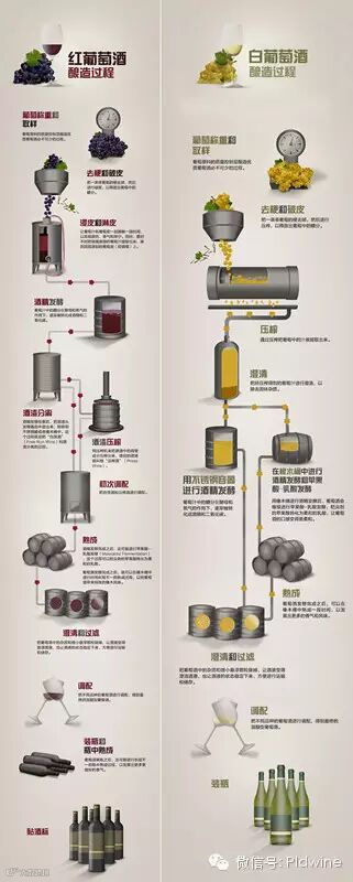 红葡萄酒和白葡萄酒的不同之处有哪些呢?是否单单只是品种不同而已?通过本文,您就可以知道,红白葡萄酒之间的不同可不仅仅在于品种而已,它们的酿造方式其实也有所不同。为了让您可以一目了然地看清两种葡萄酒在酿造方法上的不同,我们精心制作了它们各自的酿造流程图,如下图所示: