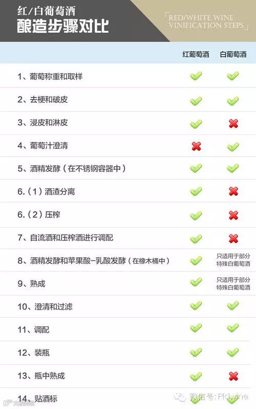 接下来是一张简单的表格,上面列出了红/白葡萄酒在酿造过程中可能需要经过的所有步骤,并标出两种葡萄酒各自需要进行或者不需要进行的步骤有哪些。即: