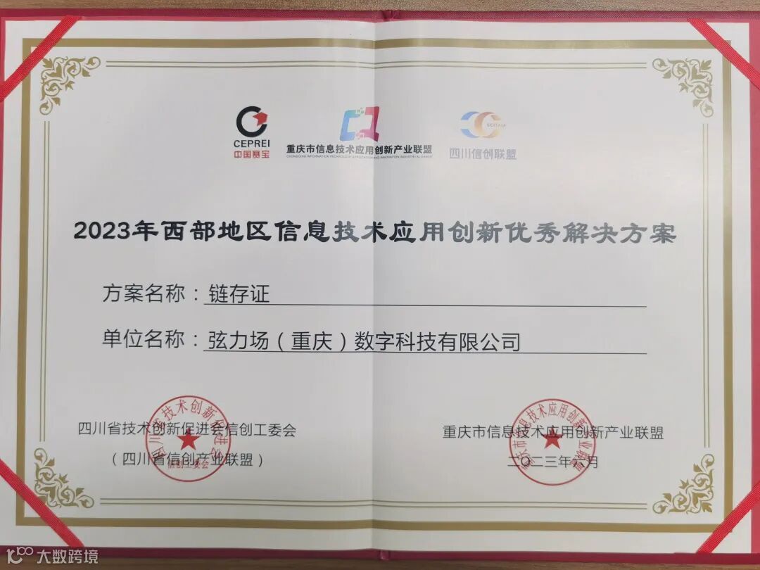6月7日, “2023西部信息技术应用创新产业生态大会”在重庆顺利召开。弦力场(重庆)数字科技有限公司作为信创领域优秀企业受邀参与本次大会,并凭借自主研发的链存证、HiteBaas区块链公共服务平台两项产品获评“2023年西部地区信息技术应用创新优秀解决方案”,是西南区域区块链行业唯一获奖单位。
