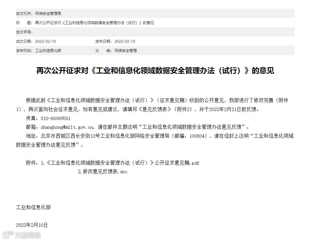 2月10日,工信部再次公开征求对《工业和信息化领域数据安全管理办法(试行)》的意见。