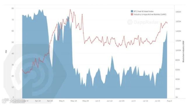 1、恐惧与贪婪指数 (FGI)和独立用户数。FGI 是一个被加密货币交易者广泛用作衡量整个行业整体情绪的指标,FGI 是一个从 0 到 100 的分数,(0)代表非常恐惧,(100)代表非常贪婪,通过将 FGI 与行业自 4 月以来的独立用户数量进行了比较,发现了一些比较有趣的结果。四月初,加密行业独立用户数出现上升,五月中旬因为加密货币价格暴跌,用户数也开始下降,FGI 指数在短短几天内从贪婪变为恐惧。不过自5 月底到 7 月中旬,独立用户数在“市场恐惧”期间依然能维持在 100-120 万左右。