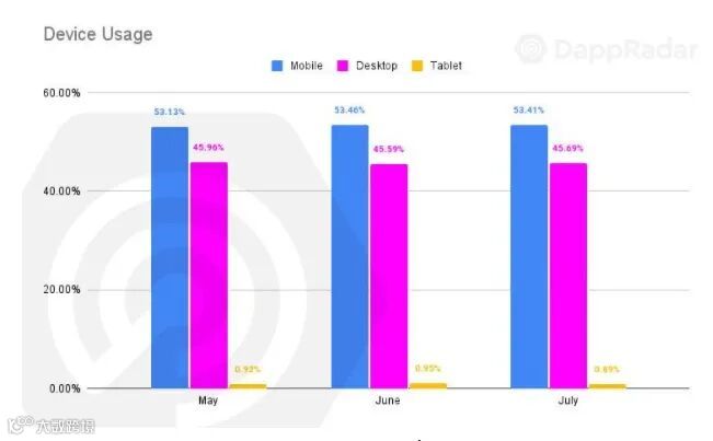 地理分析可以让我们了解区块链用户来自哪里,但了解用户如何访问行业数据也很重要。根据 DappRadar 7 月网络数据显示,53.4% 的用户通过智能手机连接,45.7% 通过桌面客户端作为连接方式。