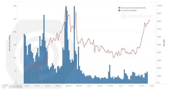 2、Gas 价格和多链范式。以太坊 gas 价格推动了多链市场发展,因为人们需要更便宜的交易费用和更低的交易延迟。随着以太坊 gas 价格达到历史高点(5 月 12 日,Gas 价格接近 300 GWei),币安智能链上独立钱包数量增长到 990,200,就在许多人都以为币安智能链将吸引更多区块链用户的时候,人们忽然意识到 Polygon 也是另一个不错的选择。不过,尽管币安智能链和 Polygon 都取得了巨大进步,但在锁仓量方面,以太坊仍然处于领先位置。市场反应正如预期的那样,随着 ETH 价格不断走高,DeFi 市场再次兴起,本文撰写时据 DeBank 数据显示,以太坊上的 DeFi 总锁仓量已经达到1020亿美元。
