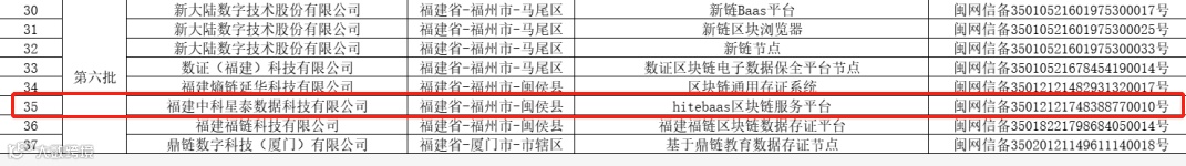 其中,由福建中科星泰数据科技有限公司开发建设的Hite Baas区块链服务平台通过审核,备案号为:闽网信备35012121748388770010号