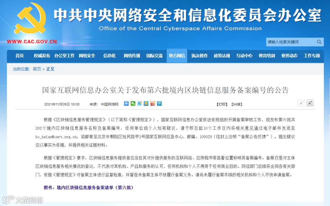 11月9日下午,国家互联网信息办公室公布了第六批共 202个境内区块链信息服务名称及备案编号。