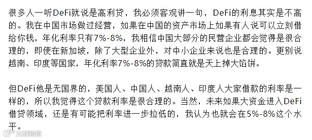 保险公司:创设DeFi本金保值的保险产品,拓宽DeFi池子的入金来源。我认为保险费的年费甚至可以收得比较高。因为传统金融机构只有年化0.1%的收益,DeFi可以做到5%,相信用户是愿意支付1%的保险费的,甚至是1.5%,因为不管怎么样,用户从DeFi获得的收益会远远高于0.1%。