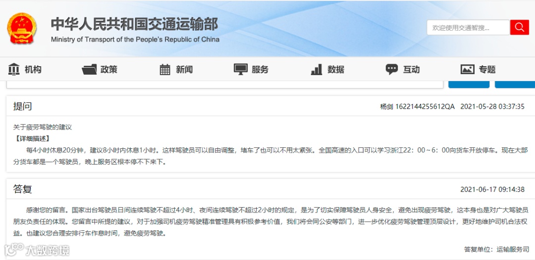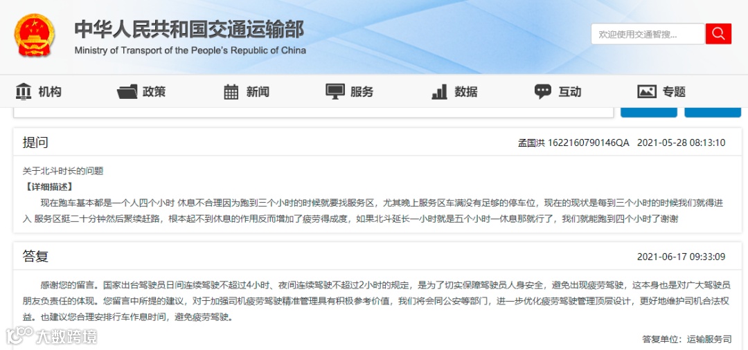 交通运输部回复