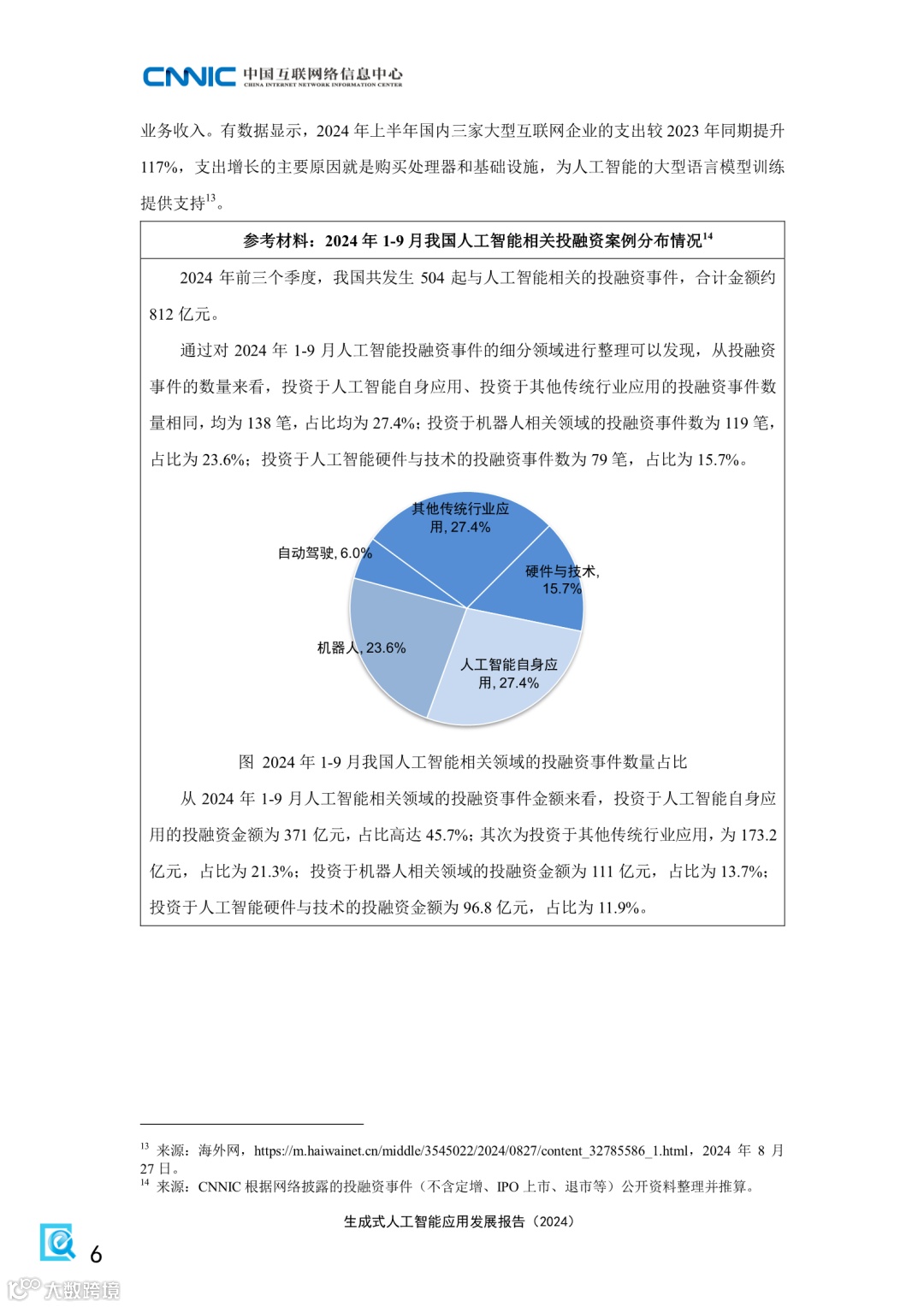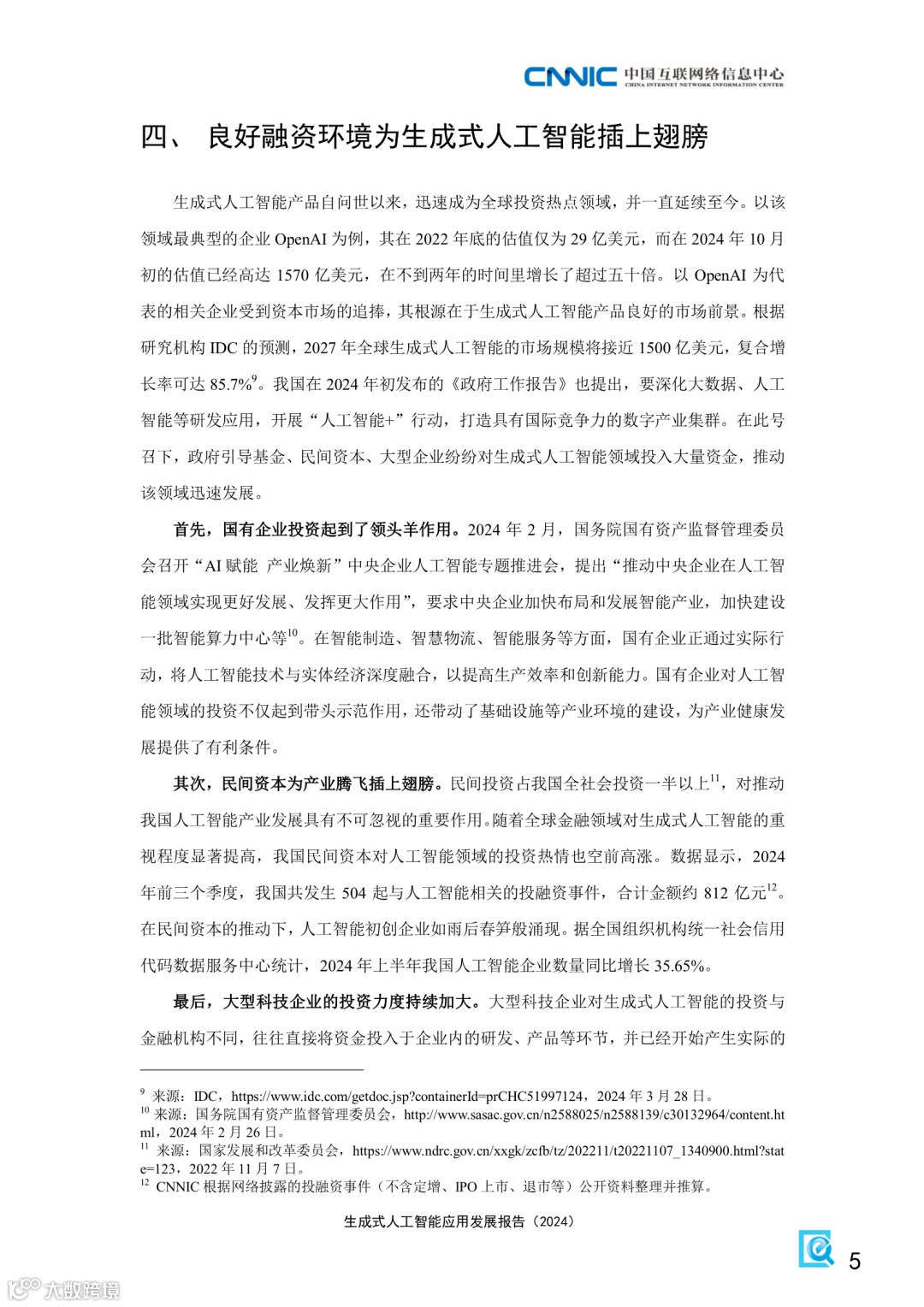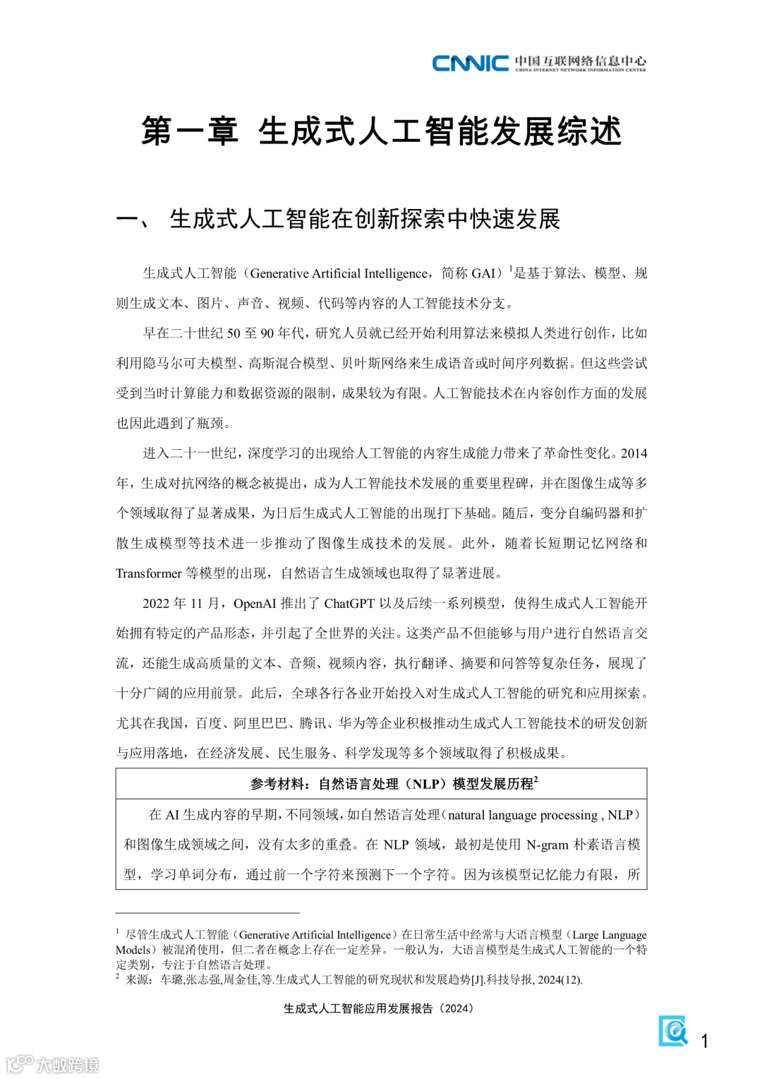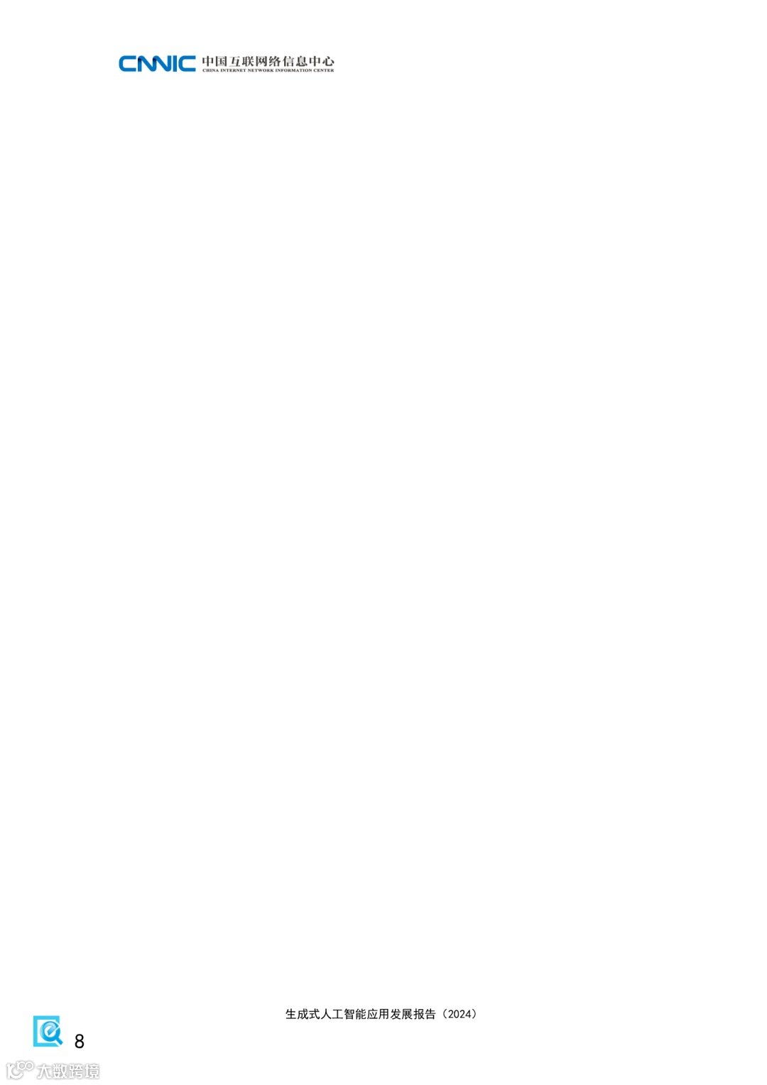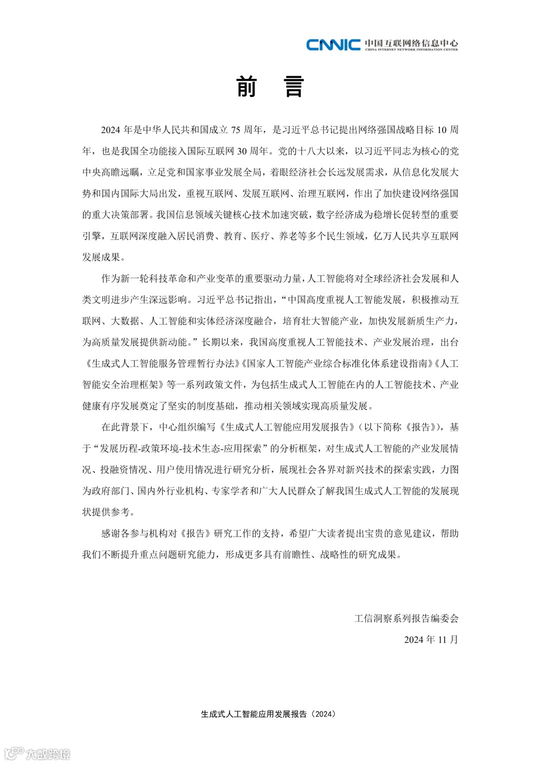 11月30日,中国互联网络信息中心(CNNIC)在第五届中国互联网基础资源大会上发布《生成式人工智能应用发展报告(2024)》(以下简称《报告》)。《报告》基于“发展历程—政策环境—技术生态—应用探索”的分析框架,对生成式人工智能的产业发展、投融资、用户使用等情况进行研究分析,展现社会各界对新兴技术的探索实践,力图为政府部门、国内外行业机构、专家学者和广大人民群众了解我国生成式人工智能的应用发展现状提供参考。