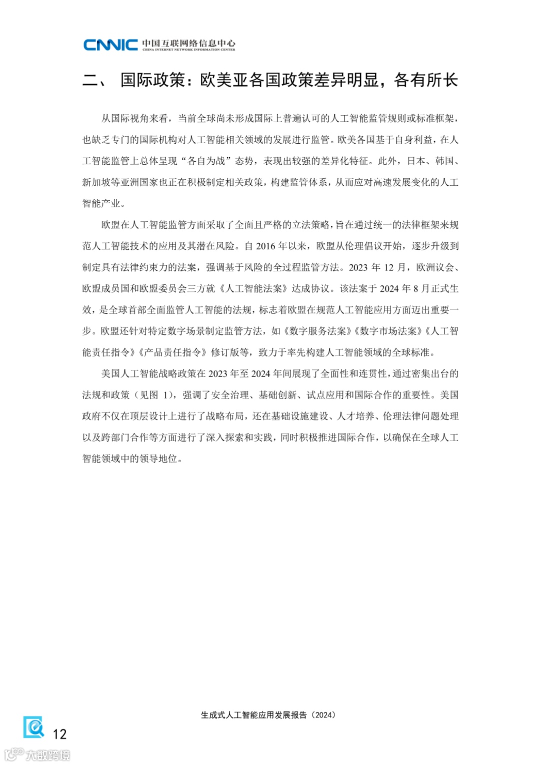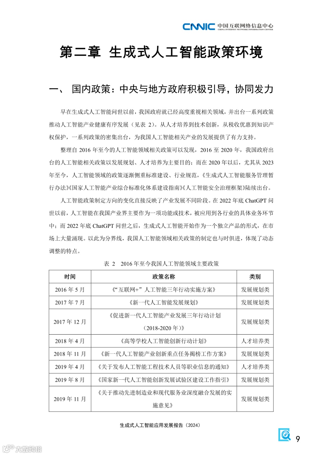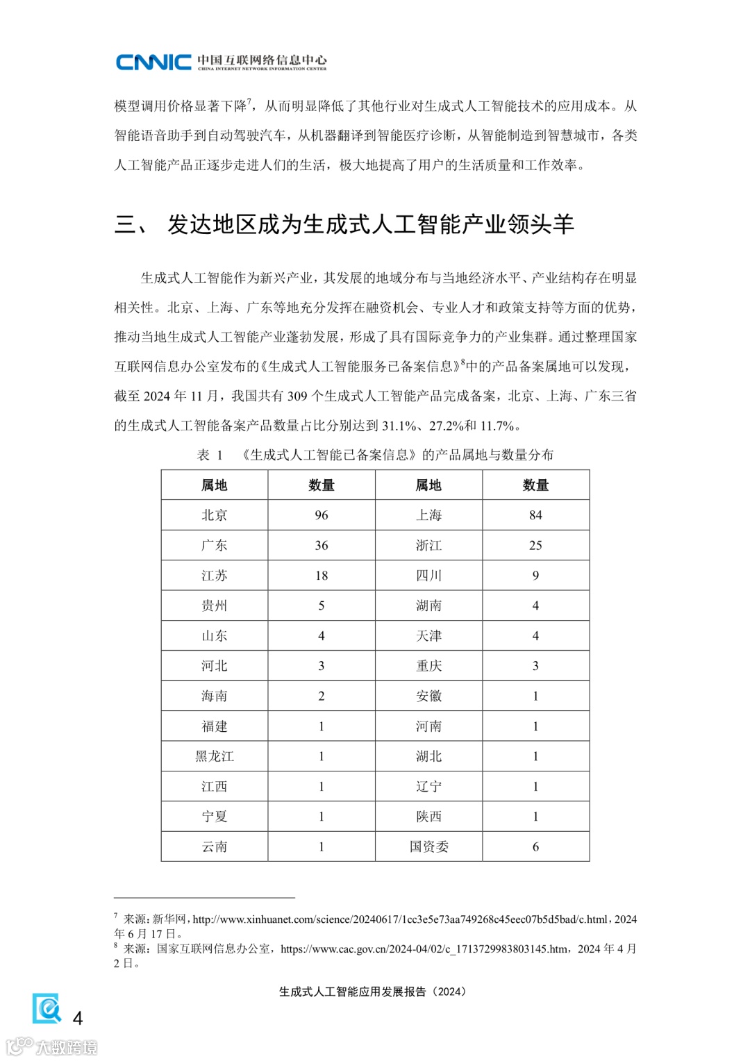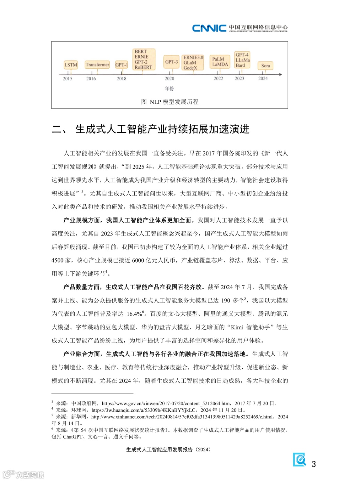 《报告》显示,我国生成式人工智能产业蓬勃发展,产业规模和产品数量迅速增加,并逐渐融入人们的日常生活。一是我国人工智能产业体系更加全面。我国初步构建了较为全面的人工智能产业体系,相关企业超过4500家,核心产业规模已接近6000亿元人民币,产业链覆盖芯片、算法、数据、平台、应用等上下游关键环节。二是生成式人工智能产品在我国百花齐放。截至2024年7月,我国完成备案并上线、能为公众提供服务的生成式人工智能服务大模型已达190多个,为用户提供了丰富的选择空间和差异化体验。三是生成式人工智能与各行各业的融合正在我国加速落地。从智能语音助手到自动驾驶汽车,从机器翻译到智能医疗诊断,从智能制造到智慧城市,各类人工智能产品正逐步走进人们的生活,极大提高了用户的生活质量和工作效率。
