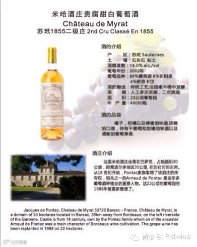她来自举世闻名的法国波尔多米哈庄园,建造于18世纪。米哈庄园为波尔多苏玳地区1855分级所属的二级名庄(Grand Cru Classe)。其酒体柔软而饱满,香气馥郁,质地浓稠,甜美而清爽,表现出完美的苏玳地区贵腐酒的典型品质