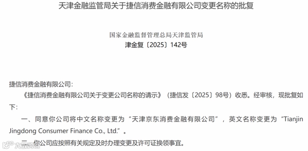 国家金融监管总局天津监管局批复同意“捷信消费金融有限公司”正式更名为“天津京东消费金融有限公司”。此次变更基于此前获准的股权重组,京东系企业通过广州晶东贸易(持股50%)和网银在线(持股15%