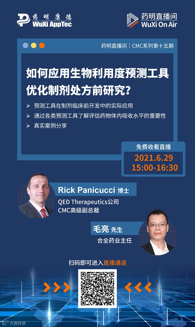 在6月29日15:00的课程中,合作伙伴QED Therapeutics公司CMC高级副总裁Rick Panicucci博士,以及合全药业主任、制剂可开发性和处方前研究团队负责人毛亮先生,则将细致地围绕“如何应用生物利用度预测工具优化制剂处方前研究”主题展开进一步分享,并带来真实案例分享。期待与您线上相见!