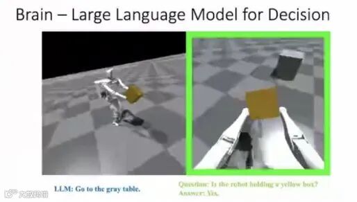 第三,大脑方面。谷歌在这一部分做了大量工作,特别是Palm-e多模态的大语言,能够对机器人的任务进行规划,大语言模型就把它所做的事情调用到下沉的控制器,按照顺序完成任务,这也是非常重要的一步,尤其对于谷歌在具身大模型方面主要的技术路线而言。