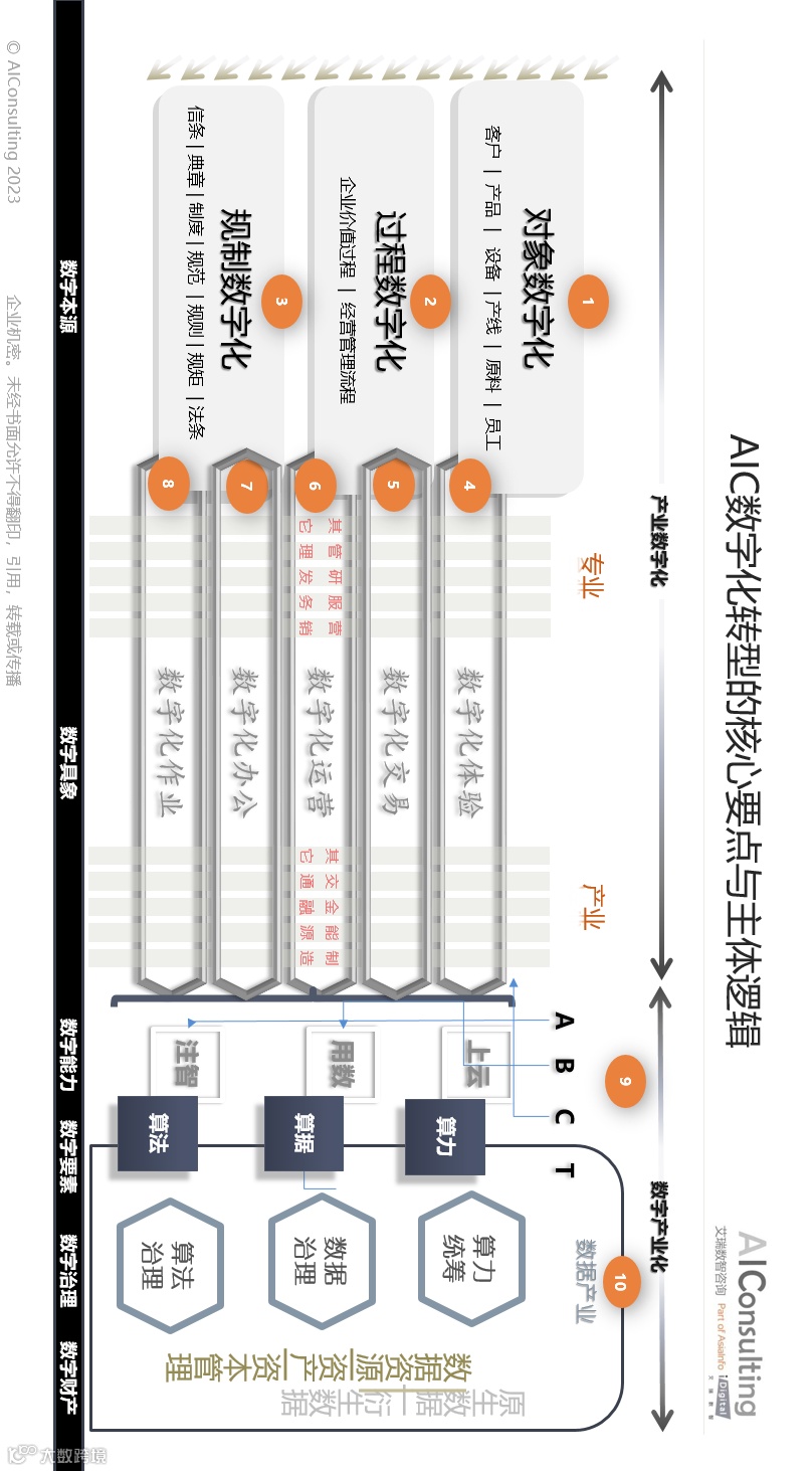 数字化转型的AIC框架自左到右体现了从数字本源,到数字具象,到数字能力、要素、数字治理和数字资产的层层架构。