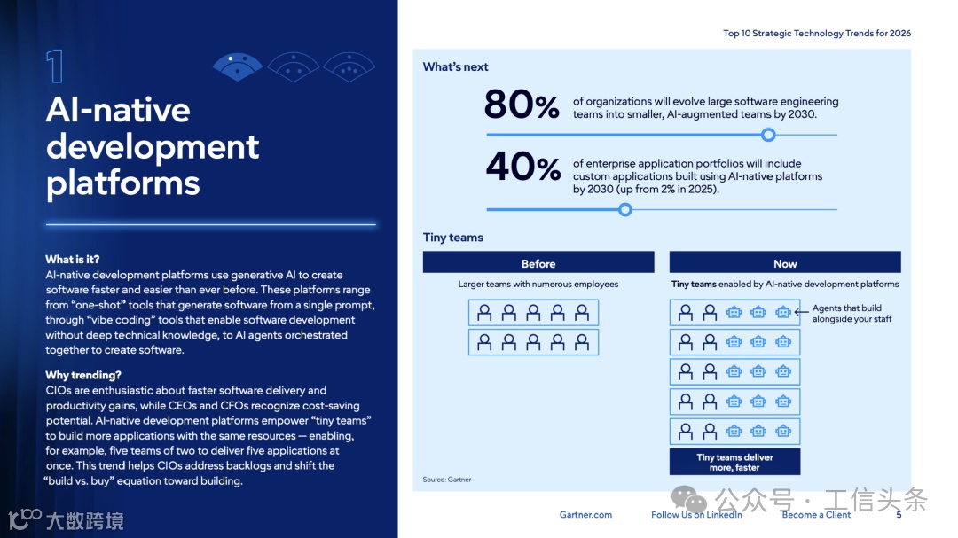 Gartner预测,到2030年,80%的企业将通过AI原生开发平台将大型软件工程团队转变为更小、更敏捷的团队并通过AI赋能这些团队。