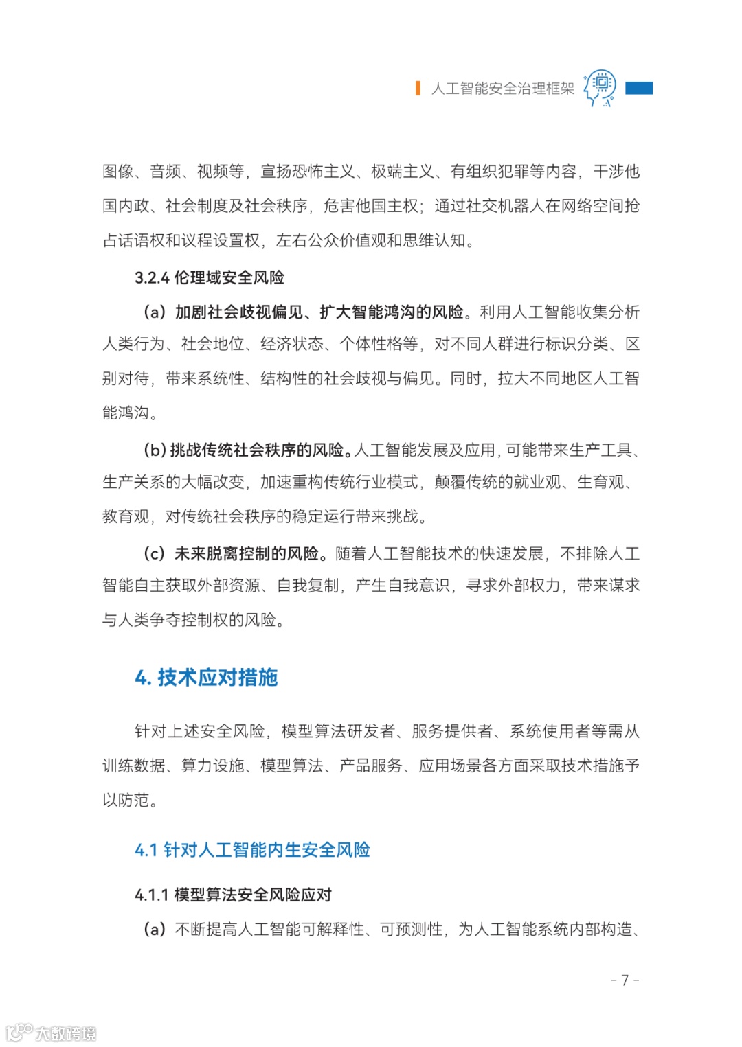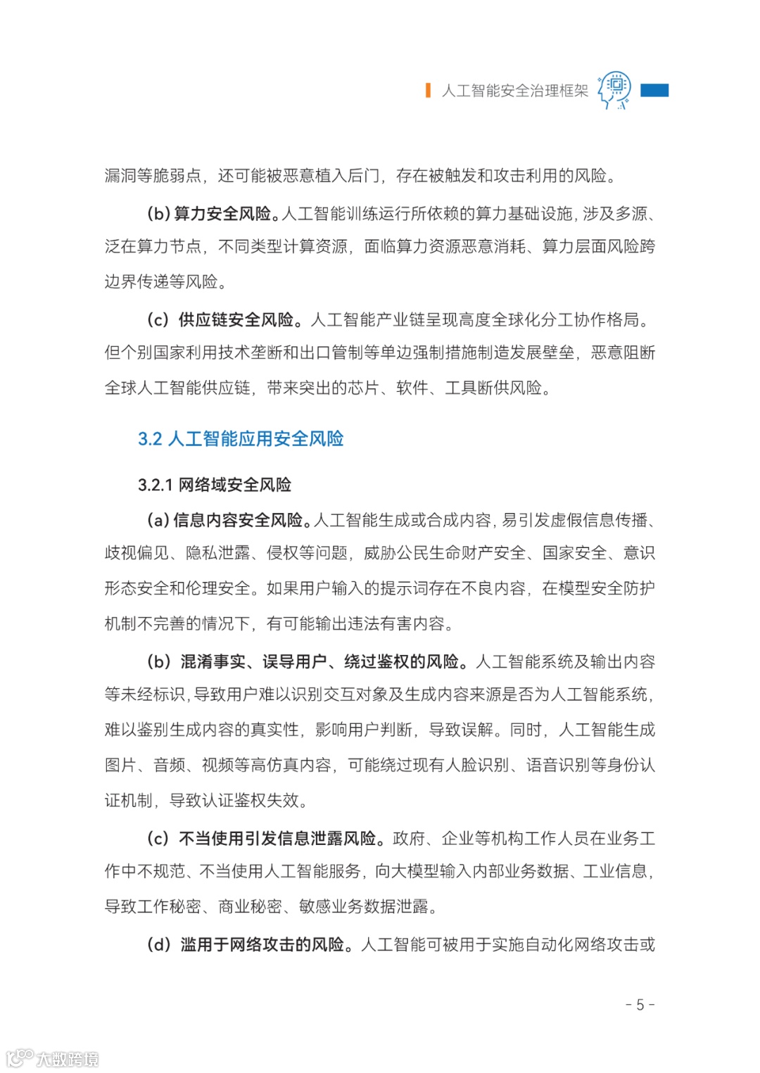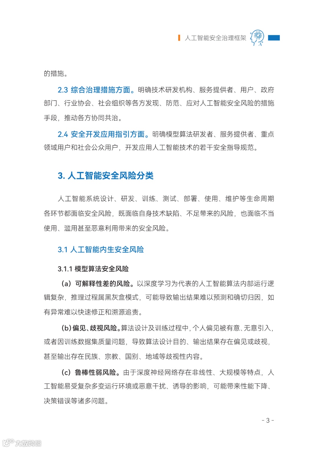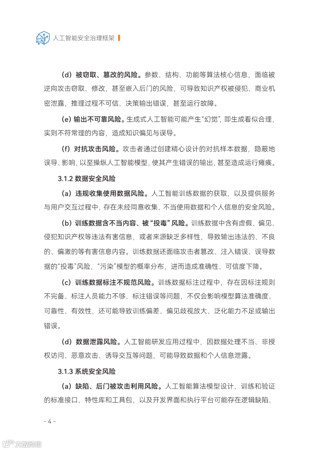 据报道,《人工智能安全治理框架》是贯彻《全球人工智能治理倡议》提出的分级分类、敏捷治理、共治共享等理念的细化深化,紧密结合人工智能技术特性,从内生、应用两个维度分析人工智能风险,从模型、数据、系统以及网络、现实、认知、伦理等角度,提出相应技术应对和综合治理措施,以推动政府、国际组织、企业、科研院所、民间组织和公民个人等各方,就人工智能安全治理达成共识。