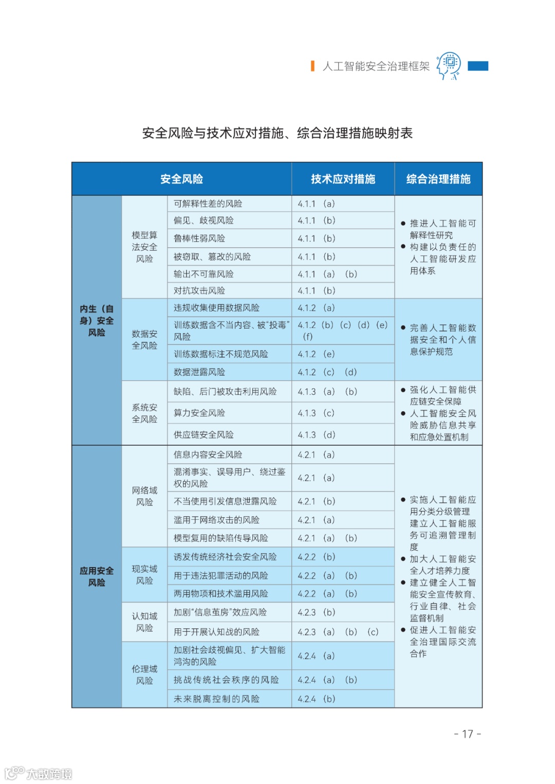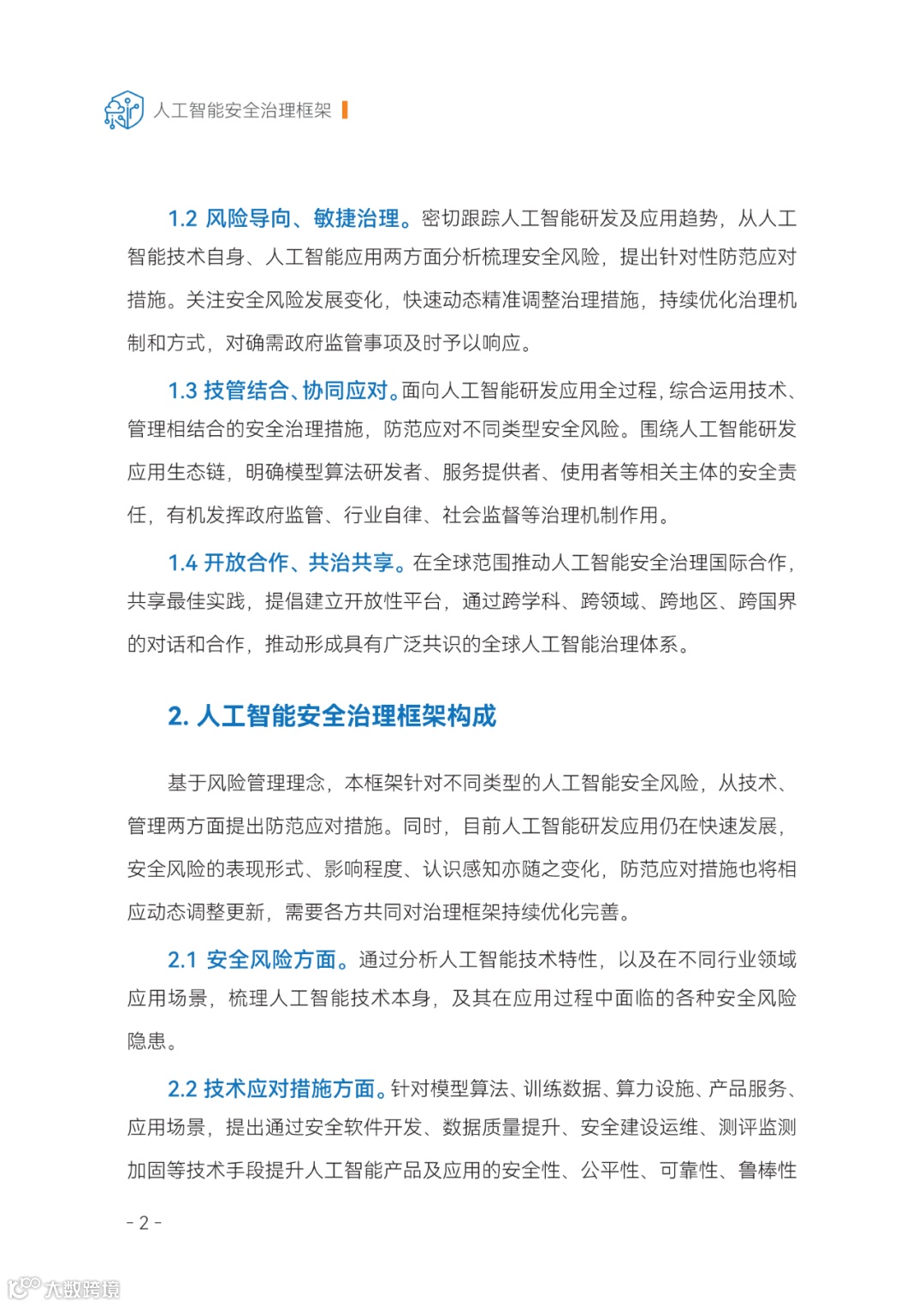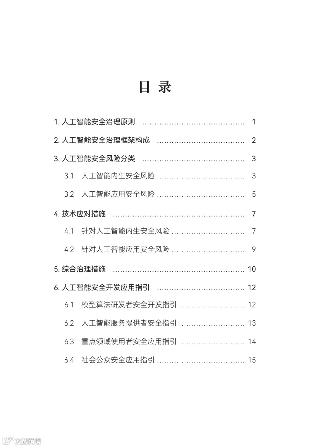框架主要由人工智能安全治理原则、人工智能安全治理框架构成、人工智能安全风险分类、技术应对措施、综合治理措施、人工智能安全开发应用指引等六部分构成。