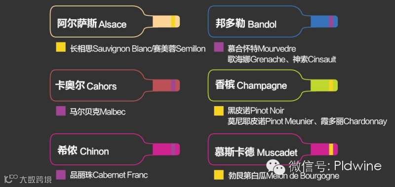 下图列出了法国主要产区的代表葡萄品种,告诉大家来自这些产区的葡萄酒最有可能采用哪些葡萄品种。当然,由于各个产区法规和习俗有所不同,也有例外情况。