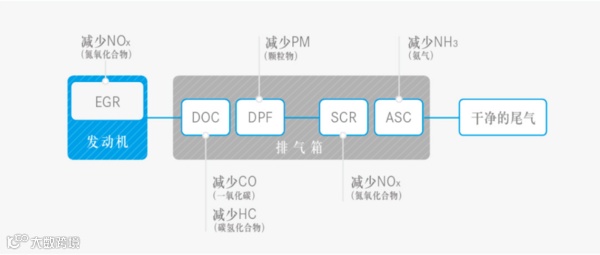 后处理增加的东西大家都比较清楚了,其中最主要的就是DPF(柴油颗粒过滤器),DPF配合DOC(氧化催化剂)使用,可以减少尾气中的颗粒物,现在国六排气管依次是DOC-DPF-SCR-ASC四个部分。