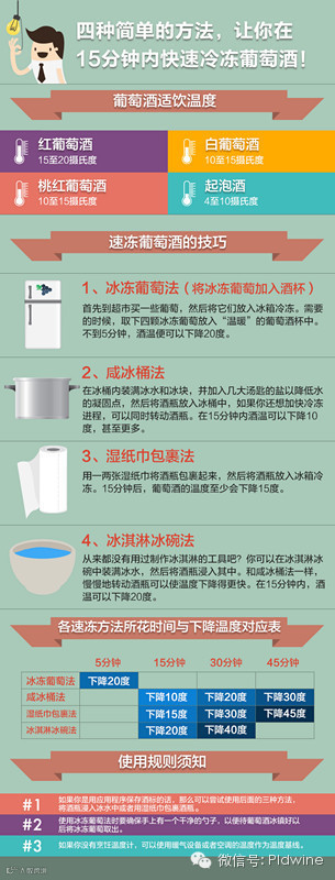 一般而言,红葡萄酒的适饮温度接近于室温,为15至20摄氏度;白葡萄酒和桃红葡萄酒的适饮温度为10至15摄氏度;起泡酒,比如香槟和普罗塞克(prosecco)还需进一步冷冻,适饮温度为4至10摄氏度。那么,如何快速冷冻葡萄酒呢?详情请看下面的图表。