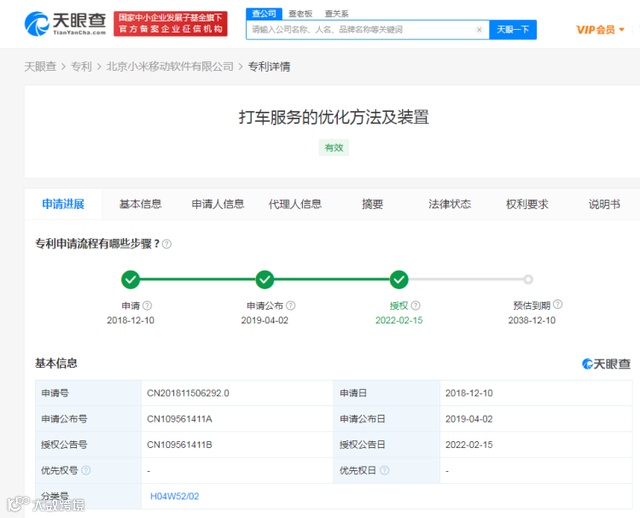 2月17日消息,天眼查信息显示,近日,北京小米移动软件有限公司获得“打车服务的优化方法及装置”专利授权,该实施例可为低电量用户优先分配车辆,避免因电量耗尽导致的打车失败。