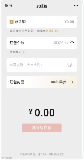 领取红包封面后点击【发红包】—【红包封面】—滑动选择【中科星泰】。