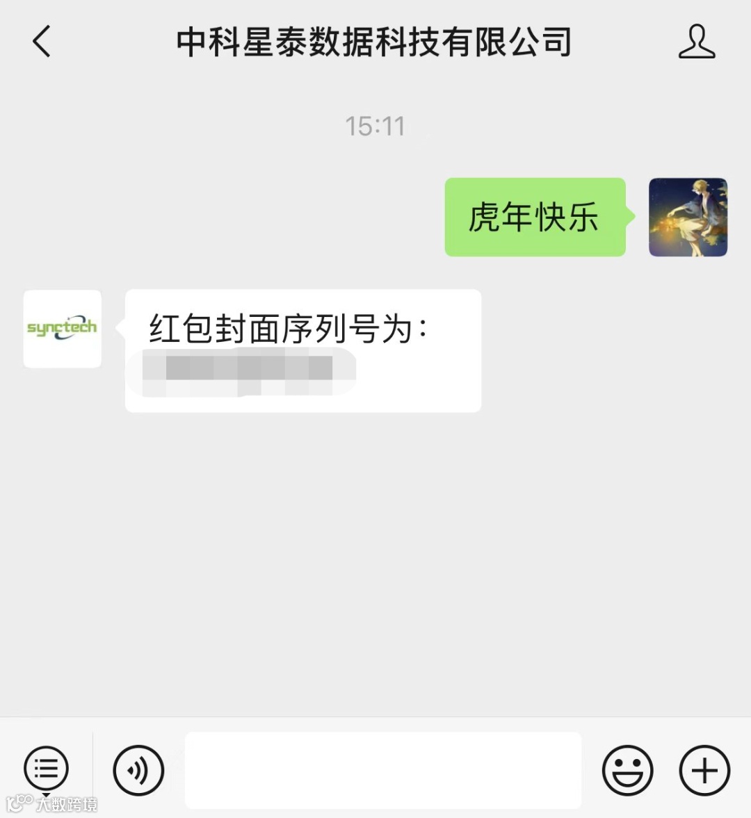 进入中科星泰公众号,在对话框输入关键词【虎年快乐】,获取红包封面兑换序列号。