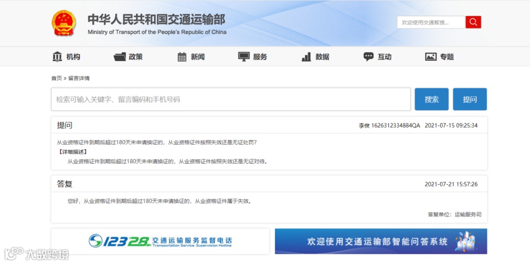 近日,有卡友在交通运输部官网留言询问:从业资格证到期180天未申请换证,是按失效对待还是无证算呢?