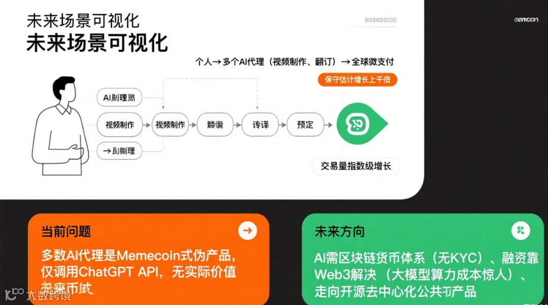 未来每个人可能拥有数百上千个 AI 代理,后台自动完成视频制作、多语言翻译、内容分发、预订、消息回复等任务 —— 这些 AI 间的频繁交互将催生海量微额支付,加密金融交易量 “保守估计增长上千倍”。