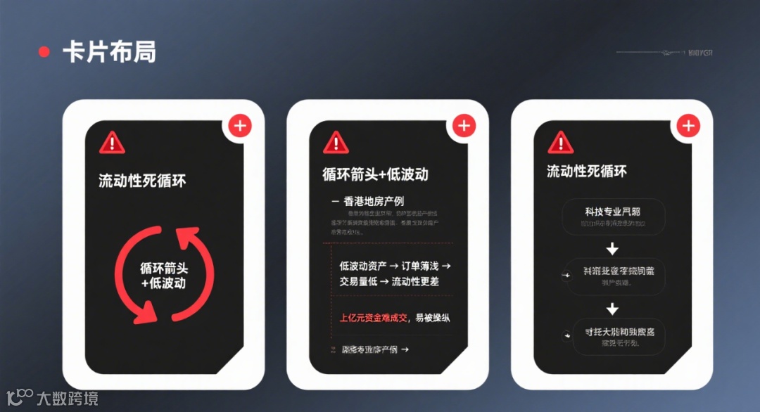 以香港房地产为例,即便市场波动较大,但其波动性仍远低于比特币—— 这类低波动资产代币化后,交易需求弱、订单簿(Order Book)深度不足,进而导致流动性低;投资者不愿下单又会加剧流动性短缺,形成 “订单簿浅→交易量低→流动性更差” 的循环。若涉及上亿元资金进出,几乎无法成交;即便资产上链,低流动性反而可能引发意外波动,甚至被短期操纵。