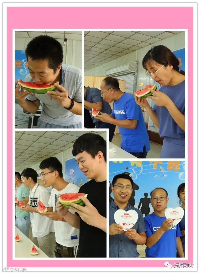 以吃瓜的方式,让捷威动力的家人们通过另一种方式认识彼此,就像小时候的夏天,和伙伴围坐在一起,快乐的眯着眼睛吃着大块的西瓜,丝毫不在意脸颊上被浸湿的妆容,放下工作中不苟言笑的严肃,有的只是大家其乐融融,做一个快乐的吃瓜群众,赢一份甜蜜的七夕奖品,赠与心爱的姑娘。我想,在捷威,这样的真实似乎才是那个温润心田的价值密码。