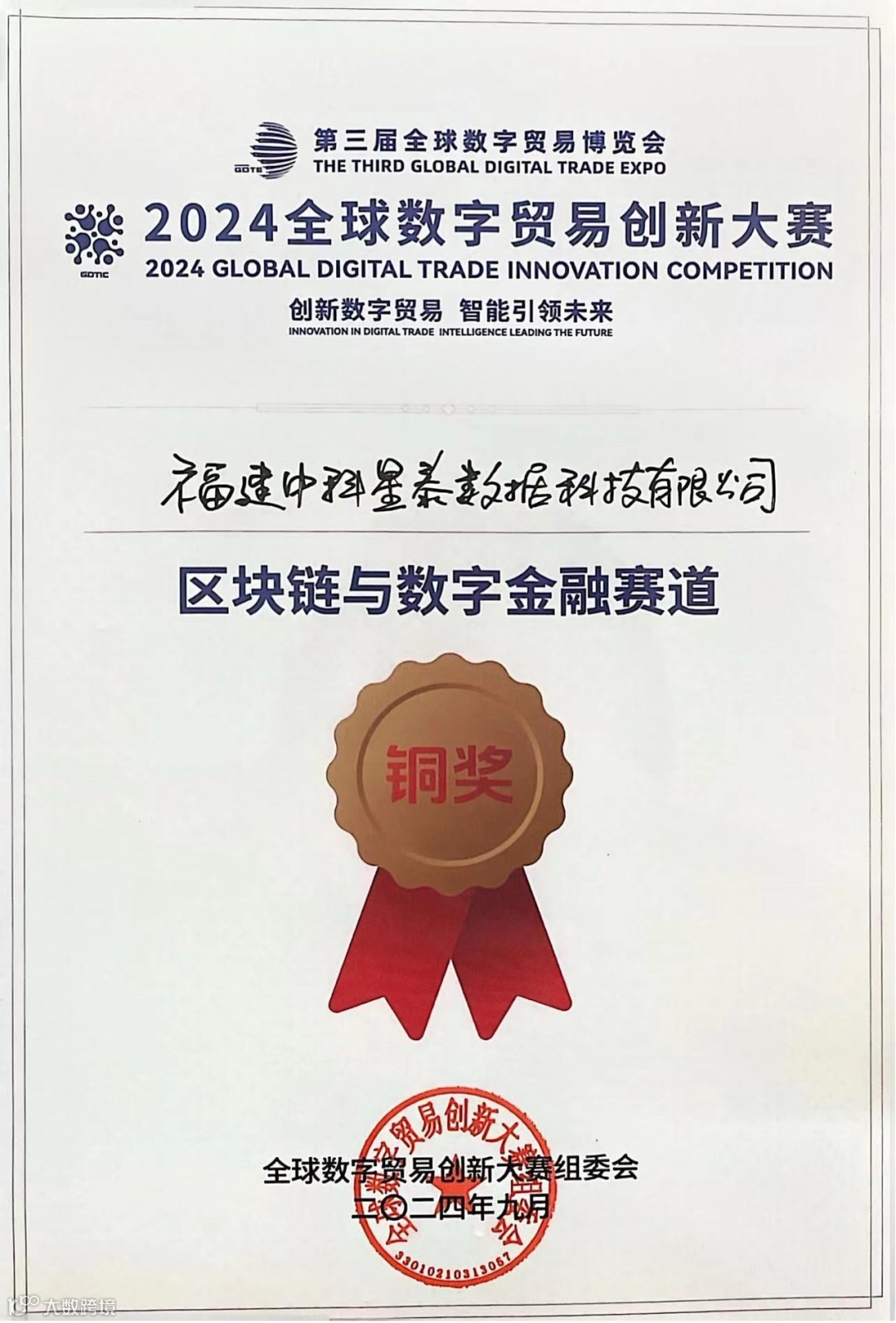 9月28日,2024全球数字贸易创新大赛(以下简称“数贸大赛”)在杭州落下帷幕。经过初赛阶段的层层筛选,福建中科星泰数据科技有限公司与来自全国各地20余家企业同台竞技。经过激烈角逐,福建中科星泰数据科技有限公司的“盈链汇”ERP系统荣获“区块链与数字金融”赛道铜奖,并荣获“创新价值企业(团队)”荣誉。