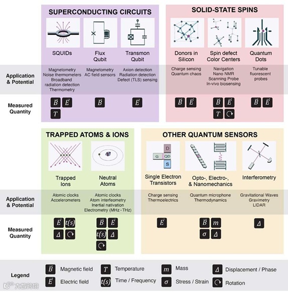 量子传感器有望显著改进传感技术的性能指标,如精度、准确性、带宽、动态范围及空间与时间分辨率,且有望实现跨频率和空间的传感器间互连,以实现新的传感模式。由于量子传感器能够提供微观尺度的精确测量,预计将在生物化学、基础物理学、导航与授时、材料科学取得有效应用。