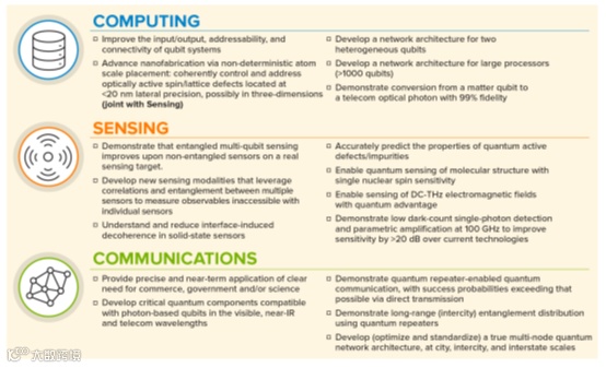 《量子互连路线图》的重点是量子互连在量子计算、通信和传感中的应用,对每类应用概述了未来10年推进研究领域所需的科学和技术要求、列出了使用的组件和系统、提出了需要解决的问题,并概述了将技术转化为实际优势的研究需求。