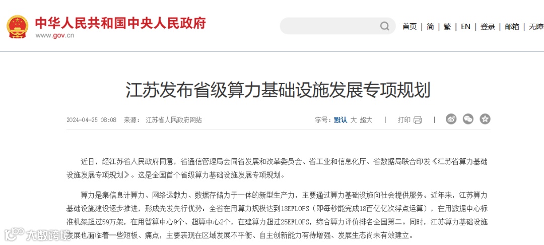 江苏首发省级算力基础设施规划:将建2个国家级核心算力枢纽