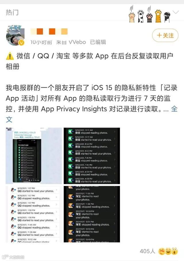 10月8日,有用户在网络贴出截图称“iOS版微信在后台反复读取用户相册”。根据用户描述,新版iOS 15的“隐私”功能有“记录APP活动”,可以存储7天内APP访问位置或麦克风等数据,上述用户发现,微信在用户未主动激活应用的情况下,在后台数次读取相册,每次读取时间长达40秒至1分钟不等。