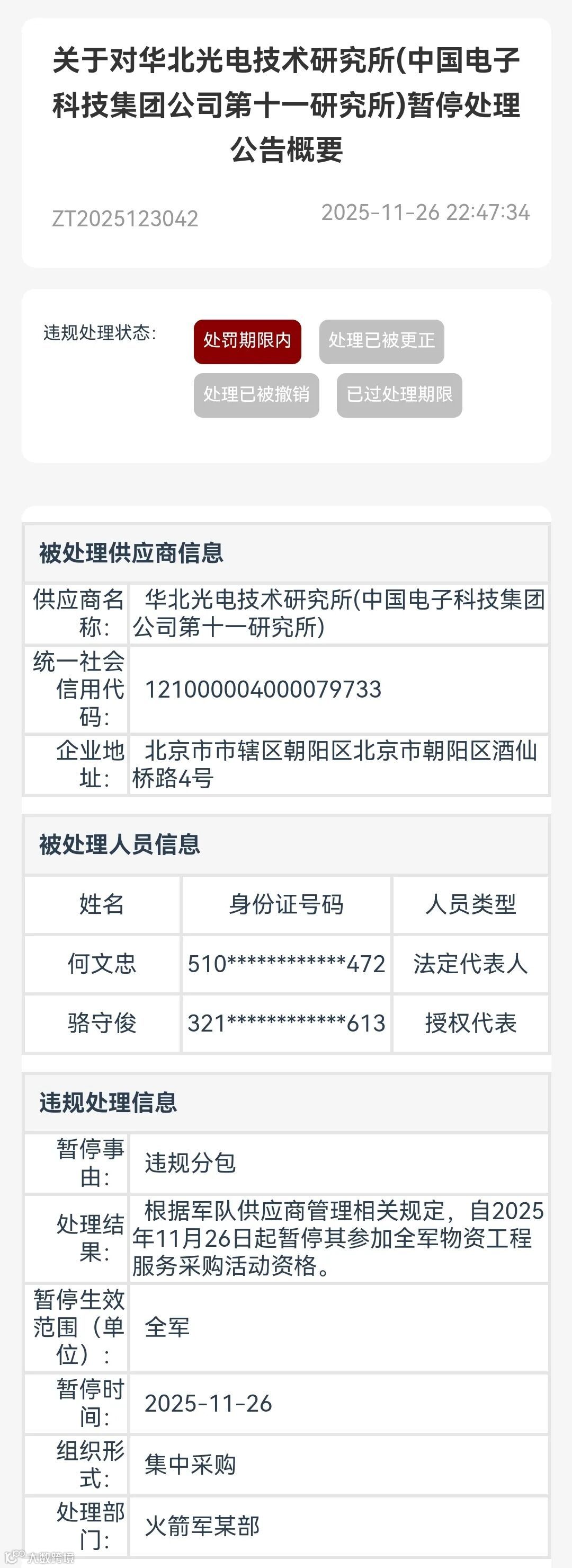 近日,军队采购网发布重磅公告,华北光电技术研究所(中国电子科技集团公司第十一研究所)因在2020-HJJBJ-1072号采购项目中涉嫌违规失信,自2025年11月26日起被暂停参加全军物资工程服务采购活动资格。这一处罚不仅直指涉事研究所本身,更牵连其关联企业与相关个人,彰显了军队采购领域严抓合规、坚守诚信的监管底线。