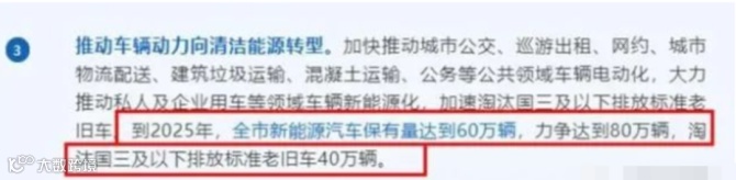 文件明确了将推动车辆动力向清洁能源转型,到2025年,将淘汰国三及以下排放标准老旧车40万辆。