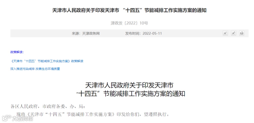 5月10日,天津市人民政府发布《天津市“十四五”节能减排工作实施方案》。
