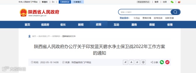 近日,陕西省人民政府办公厅发布《关于印发蓝天碧水净土保卫战2022年工作方案的通知》。