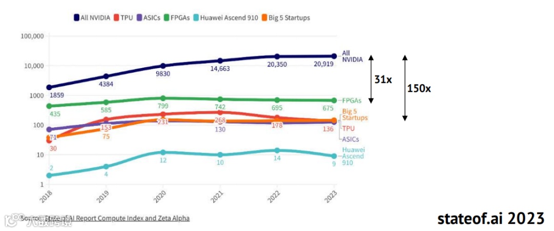 在去年的报告中,我们开始跟踪人工智能研究论文中特定半导体的利用情况。我们发现,英伟达芯片被引用的次数远远多于替代品。2023年,英伟达GPU更受欢迎:比FPGAs多31倍,比TPUs多150倍。