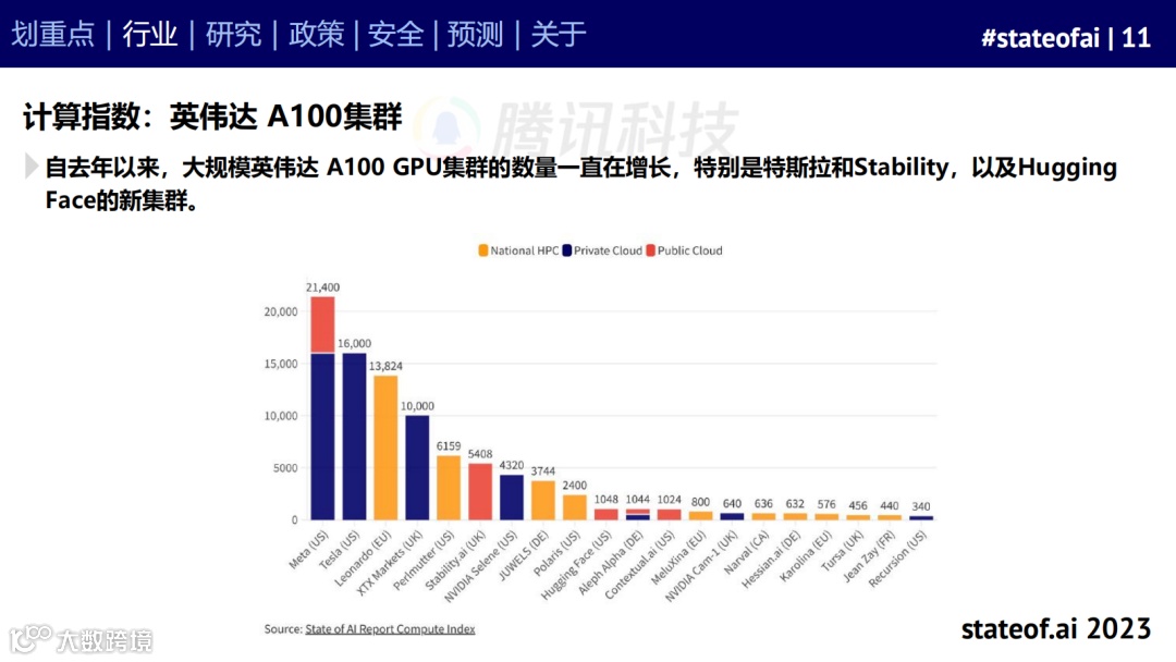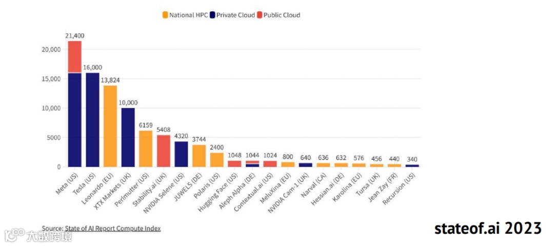 自去年以来,大规模英伟达 A100 GPU集群的数量一直在增长,特别是特斯拉和Stability,以及Hugging Face的新集群。