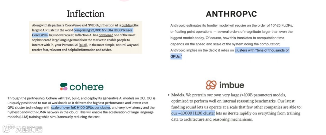 现在还为时尚早,但私营和上市公司正在宣布新的H100基础设施,用于大规模模型培训。截至10月中旬,谷歌和Inflection尚未全面发展,我们知道其他公司包括OpenAI、Anthropic、Meta、Character.ai、 Adept、Imbue等都有很大的能力。我们预计不久会有更多的产品上线。